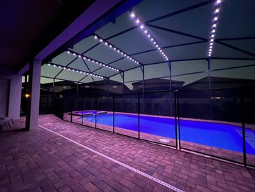 Introducing our innovative pool enclosure track lighting system. The perfect blend of style and functionality to elevate your outdoor experience. Crafted with a durable, powder-coated aluminum track that seamlessly complements your existing enclosure, this cutting-edge system offers long-lasting performance. Effortlessly control MILLIONS of color options via Bluetooth to set the perfect mood, whether you're hosting guests or unwinding poolside. With its sleek design and versatile lighting capabilities, our system not only brightens your space but also adds a touch of elegance to your outdoor oasis.